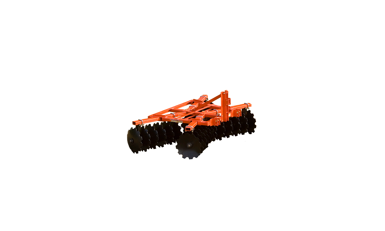 Designed for 60 to 100 horsepower tractors, these units are built of 5” x 3” high yield tube steel and feature trunion triple sealed ball bearings. They have Category 2 compatible hitches. The gangs have 1 1/2” square high strength axles. Each unit is equipped with adjustable gang angles. The units have 9” or 10 1/2” blade spacing with 22” or 24” notched blades standard. Plain blades optional.