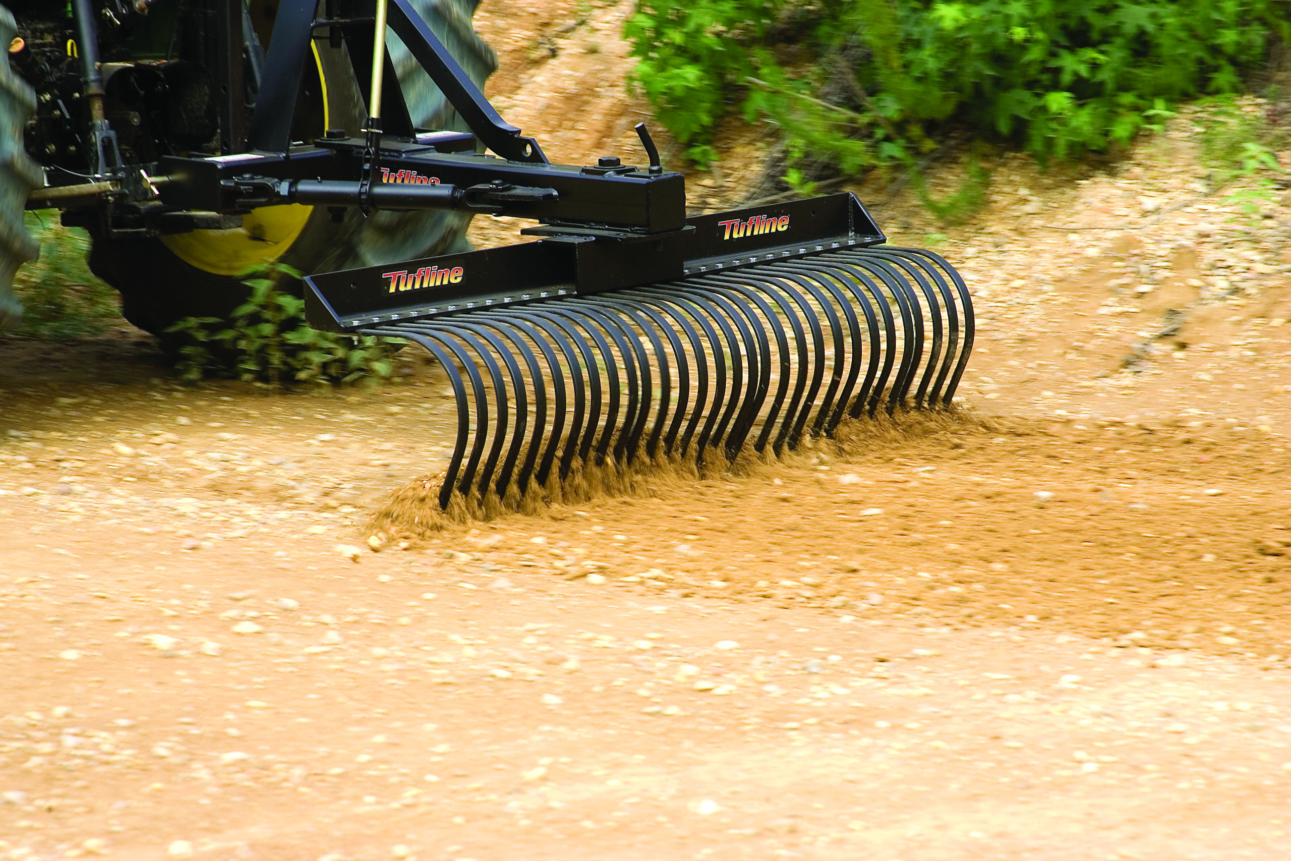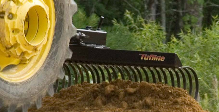Tufline’s LR series landscape rakes are quality built units that offer many versatile landscape applications. These rugged rakes allow the operator the ability to perform tough cleanup jobs such as rock and root removal, spreading of topsoil, mulch or crushed rock, and general site grooming for either large or small construction projects.